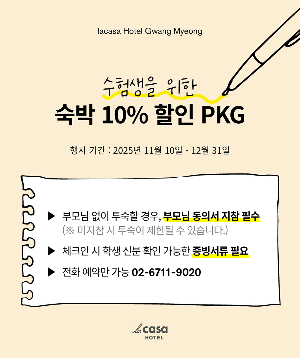 라까사호텔 광명은 건조한 삶 속에서 일상의 의미를 되새겨 줄 특별한 호텔입니다. 집처럼 아늑한 객실 디자인, 자연과 문화가 공존하는 다양한 라이프스타일 콘텐츠, 다이내믹한 광명의 로컬 문화가 합쳐져 새로운 호텔 라이프를 만듭니다.